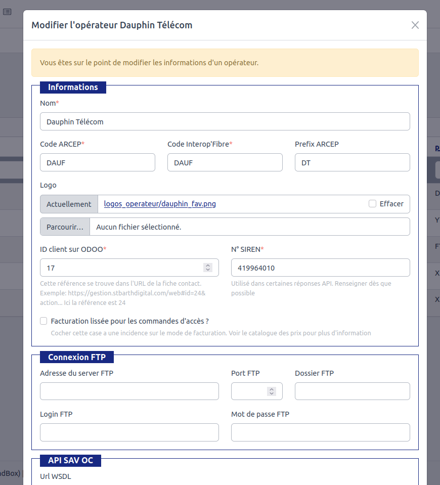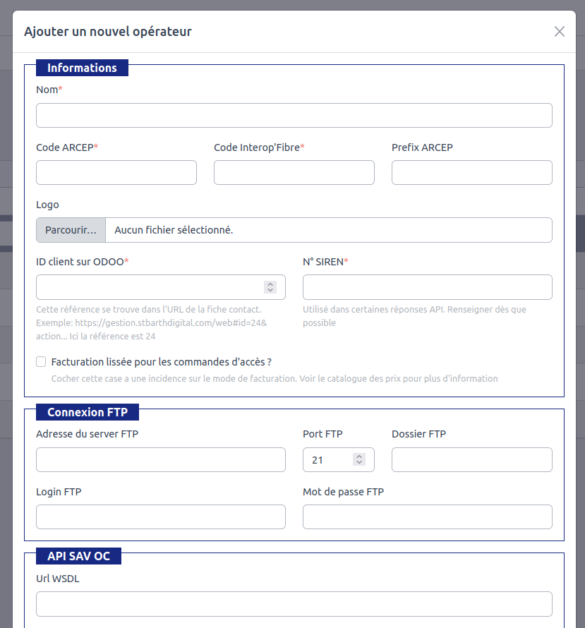 Pour que OICONNECT puisse entièrement gérer toutes les interactions conformément au protocole INTEROP’FIBRE et la synchronisation avec l’ERP ODOO, la fichechaque opérateur doit contenir les informations suivantes :