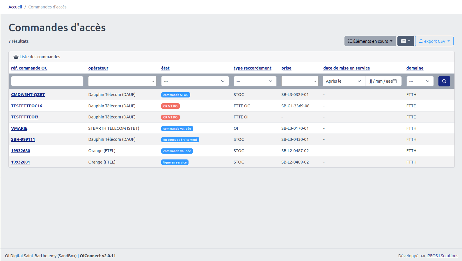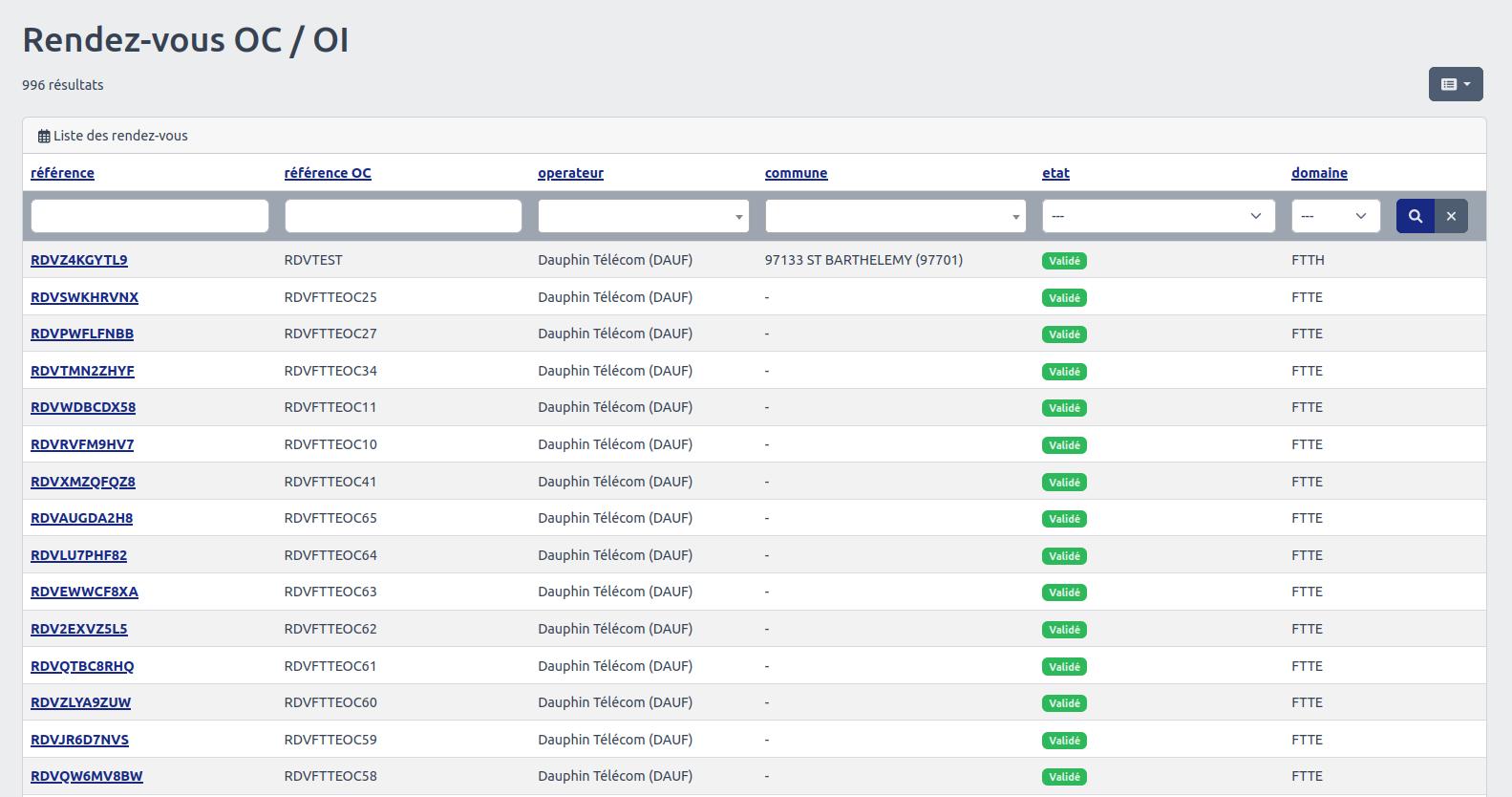 Attention : Les raccordement par l'OI doivent faire l'objet d'une validation de date de RDV préalable par l'OC auprès de l'OI avant l'envoi de la commande. Dans le "menu" principal" à la section "Gestion / RDV" sont listées toute les demandes de RDV à valider ou à modifier.